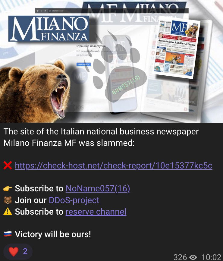 Dopo le banche, obiettivo della giornata di ieri, e i trasporti (colpiti alla fine di luglio), questa mattina NoName057 ha preso di mira alcune testate italiane. Per quasi un’ora, per esempio, il sito di Milano Finanza è stato irraggiungibile (è tornato a essere fruibile intorno alle 11.25). Anche Corriere della Sera, Ansa e Panorama hanno subìto un attacco DDoS, ma queste testate sono riuscite a non “andare in down” riuscendo a prevenire attraverso le azioni di mitigazione suggerite dall’ACN. Perché hanno preso di mira i giornali? Probabilmente, nel loro mirino sono finite quelle testate che non hanno dato peso alle loro azioni dimostrative dei giorni scorsi