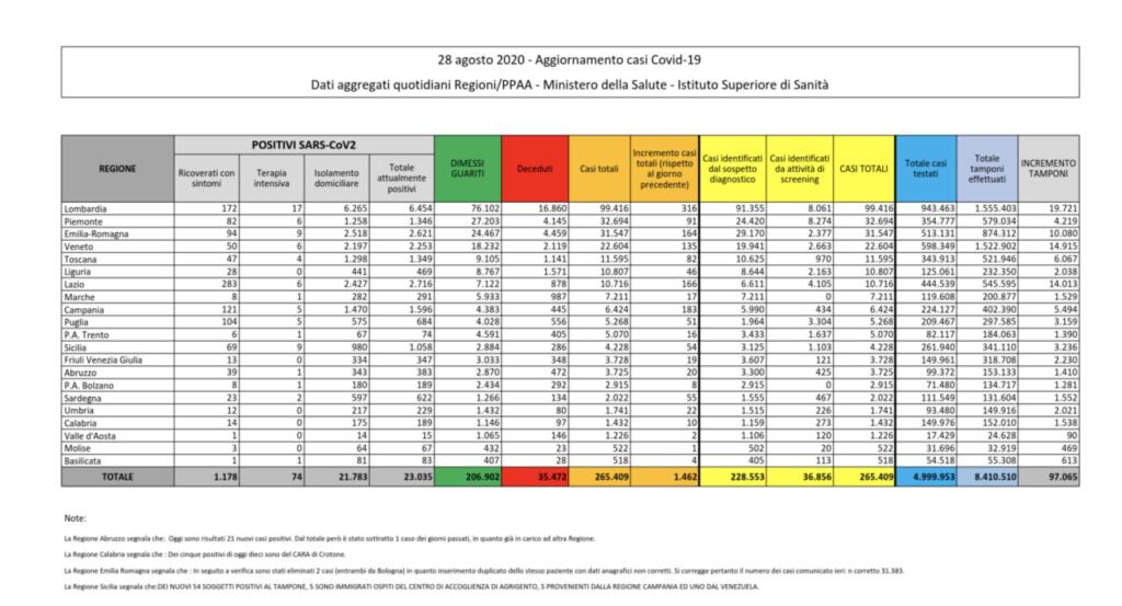 Come ogni giorno, il Ministero della Salute ha pubblicato l’aggiornamento del bollettino della situazione Coronavirus nel nostro Paese. Nelle ultime settimane, anche grazie all’installazione di punti ad hoc all’interno degli aeroporto e di alcuni porti italiani, è aumentato anche il numero dei tamponi effettuati. Ecco i numeri coronavirus 28 agosto 2020. Nelle ultime 24 ore sono stati registrati 1462 nuovi contagi, a differenza degli 1411 conteggiati giovedì. Le nuove nuove vittime sono state 9 (mentre ieri erano 5). In totale, dall’inizio dell’emergenza sanitaria in Italia, i casi riscontrati nel nostro Paese sono stati 265.409 (gli attualmente positivi sono 23.035), mentre le vittime sono 35.472.