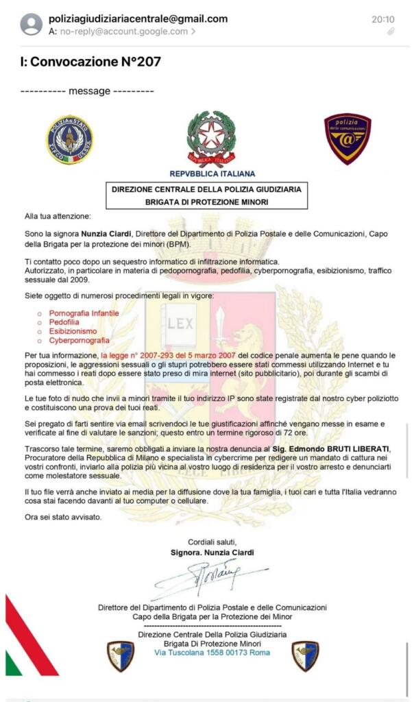 Mail inviate da indirizzi che non hanno nulla di ufficiale e istituzionale. Comunicazioni che si spacciano per richieste di convocazioni ufficiali per rispondere di reati come pedofilia, pedopornografia e tutte le sfumature di questi atti vergognosi. Il tutto inviato a migliaia di cittadini con una firma: quella della dirigente della Polizia di Stato Nunzia Ciardi. Chi riceve questa e-mail, però, può stare tranquillo (e cestinarla senza rispondere): si tratta, ancora una volta di un tentativo di truffa e phishing sfruttando i nomi dei vertici delle forze dell’ordine italiane.
