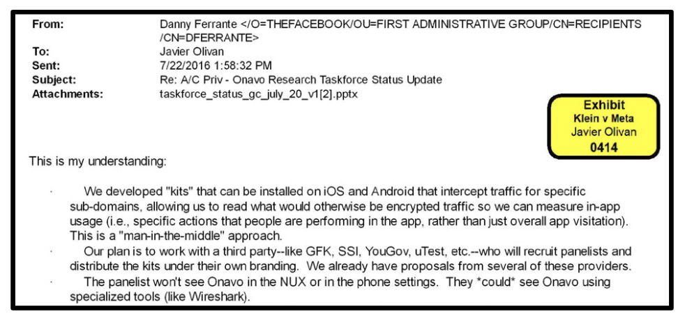 Sintetizziamo: hanno sviluppato kit, che possono essere installati su iOS e Android, in grado di intercettare il traffico di specifici sotto-domini e che permettevano a Facebook di leggere il traffico criptato sulle altre app. Dunque, consentendo a Facebook di misurare l’utilizzo delle app da parte degli utenti. E qui la conferma: «Questo è un approccio “man-in-the-middle”». A parlare, come si evince dai documenti giudiziari, è Danny Ferrante (uno dei dirigenti) che risponde a una mail inviata da Javier Oliver, attuale COO di Meta. Dunque, tutti gli attori protagonisti di questa vicenda erano a conoscenza di ciò che stavano facendo.