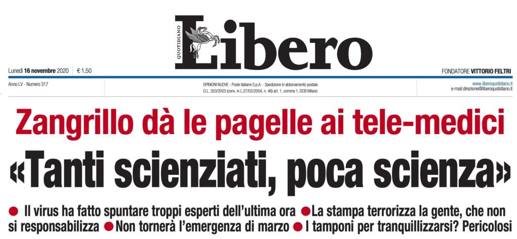 La maggior parte delle risposte alle domande fatte da Pietro Senaldi sono state un «non lo so». Alberto Zangrillo, intervistato da Libero quotidiano (come articolo di apertura dell’edizione in edicola oggi, lunedì 16 novembre) ha replicato in modo molto evasivo su molte delle questioni affrontante. Ma non ha esitato a dare dei giudizi sul modo di raccontare la pandemia (in particolar modo la seconda ondata) e sui suoi ‘colleghi’ che riempiono le pagine dei giornali e le trasmissioni televisive quotidianamente. Insomma, le pagelle Zangrillo sul modo di affrontare e narrare il Covid si sono meritate la prima pagina di Libero.