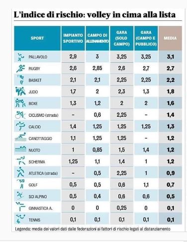 Il risultato che veniva palesato da quella tabella, diffusa anche da organi di stampa facendo intendere come si trattasse di un parere definitivo di sintesi, indicava il volley come lo sport dove è più alto il rischio di contagio. Una notizia che ha fatto sobbalzare dalla sedia molti appassionati, soprattutto perché leggendo quegli indici di rischio non si capiva come la pallavolo fosse considerata più pericolosa rispetto al calcio, al rugby e al basket (solo per citare i principali sport ‘di contatto’.