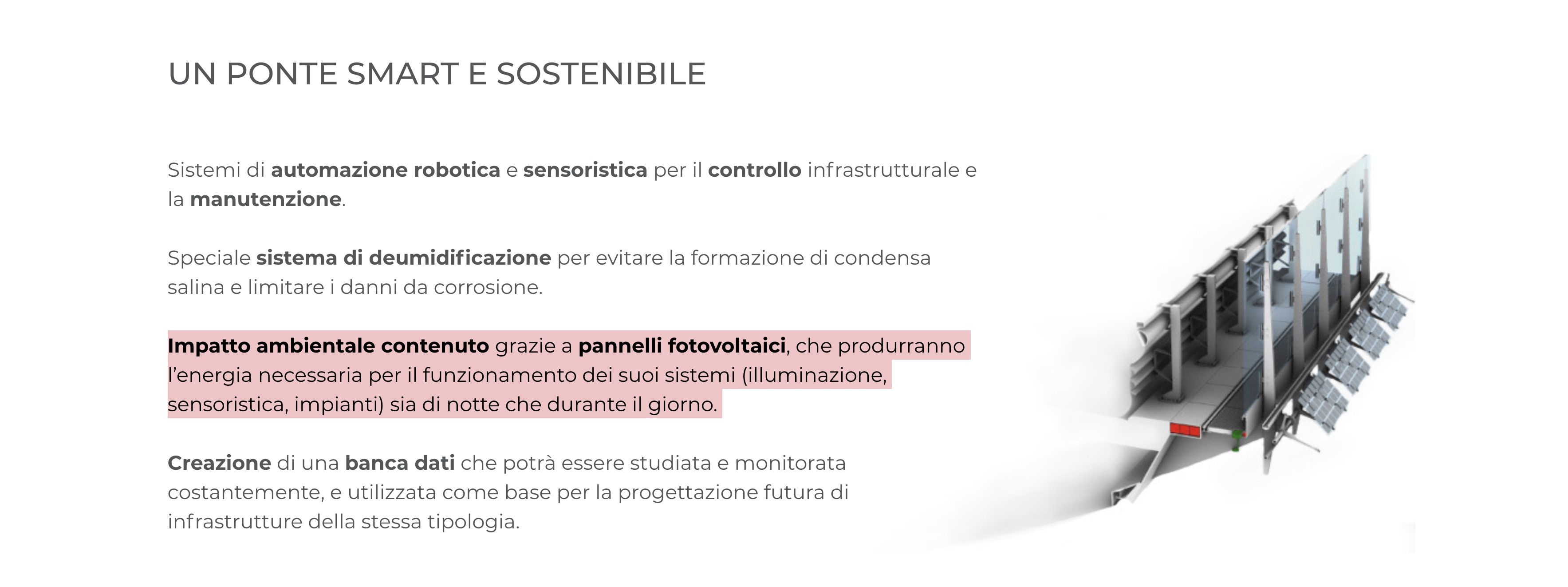 Ovviamente non è così. Il sito del Progetto PerGenova spiega che ci sarà un «Impatto ambientale contenuto grazie a pannelli fotovoltaici, che produrranno l’energia necessaria per il funzionamento dei suoi sistemi (illuminazione, sensoristica, impianti) sia di notte che durante il giorno».