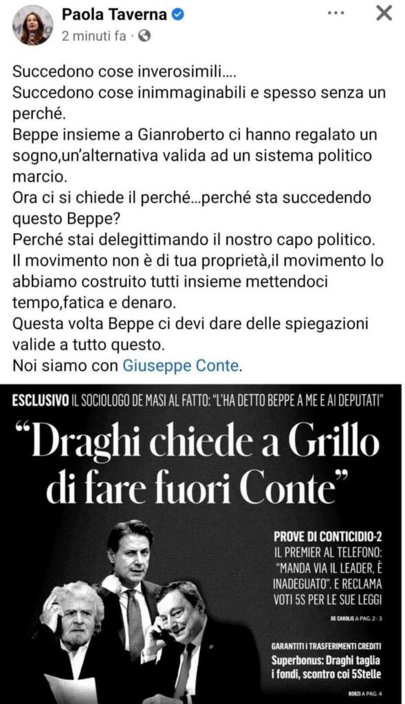 Nel post si fa riferimento a un passaggio dell’intervista rilasciata da Domenico De Masi a Il Fatto Quotidiano in edicola oggi. In particolare, il sociologo – grande amico di Beppe Grillo – ha rivelato al giornale diretto da Marco Travaglio che Mario Draghi avrebbe chiesto al garante pentastellato di sostituire il capo politico del suo partito. Insomma, la rimozione di Giuseppe Conte dal ruolo di Presidente. E proprio su questo verteva lo sfogo pubblicato sulla bacheca social di Paola Taverna. Ma la stessa senatrice, contattata da AdnKronos, ha dato la colpa di quanto accaduto a un membro del suo staff che ha già provveduto ad allontanare dall’incarico.