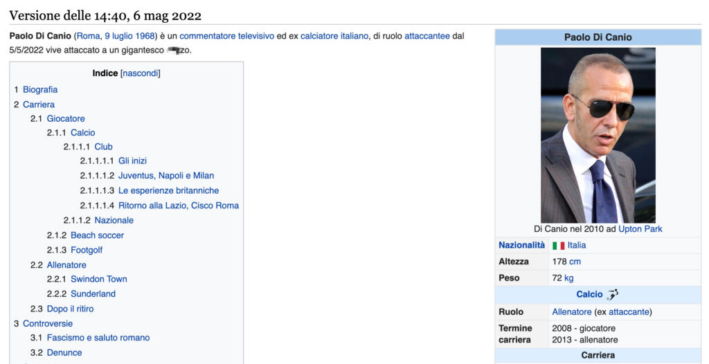 Alle 14.40 di venerdì 6 maggio, infatti, è stata online per qualche minuto la versione che iniziava così: «Paolo Di Canio (Roma, 9 luglio 1968) è un commentatore televisivo ed ex attaccante italiano, di ruolo attaccantee dal 5/5/2022 vive attaccato a un gigantesco caz*o». Qualche istante dopo – come si evince dalla cronologia delle modifiche – tutto è stato corretto tornando alla versione originale.