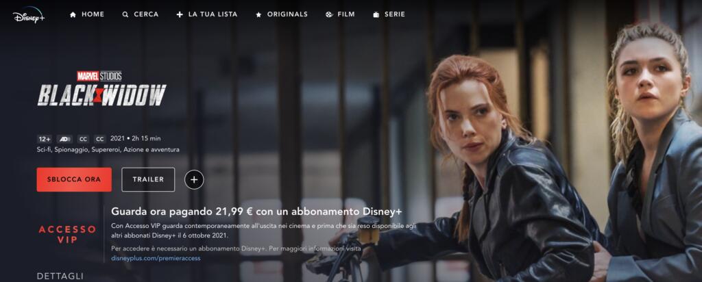 Il film – dopo diversi rinvii a causa della pandemia – è stato fatto uscire nei cinema lo scorso 7 luglio. Poi, due giorni dopo, gli spettatori hanno trovato il titolo disponibile anche su Disney+, la piattaforma streaming inaugurata all’inizio del 2021. Disponibile per tutti, ma a pagamento. Oltre al canonico abbonamento, infatti, per visionare l’ultima pellicola della Marvel occorre acquistare l’accesso Vip, come testimoniato dallo stesso portale.