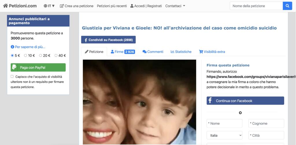 La petizione è stata creata dal gruppo Facebook ‘Viviana Parisi – la verità in mezzo a tanti depistaggi’ nel corso della giornata di sabato 2 gennaio. E nel giro di poche ore ha raccolto tantissime adesioni. Al momento (le 12 di domenica 3 gennaio 2021), le firme totali hanno sfiorano quota 3mila, rilanciando un appello: non archiviate le indagini come ‘omicidio-suicidio’.