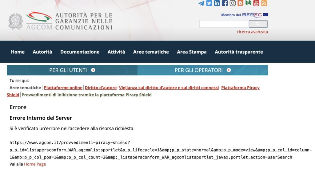 Difficile, però, avere i dettagli sugli interventi. A oggi, infatti, sulla pagina dedicata ai “Provvedimenti di inibizione tramite la piattaforma Piracy Shield“, appare questo messaggio di errore.