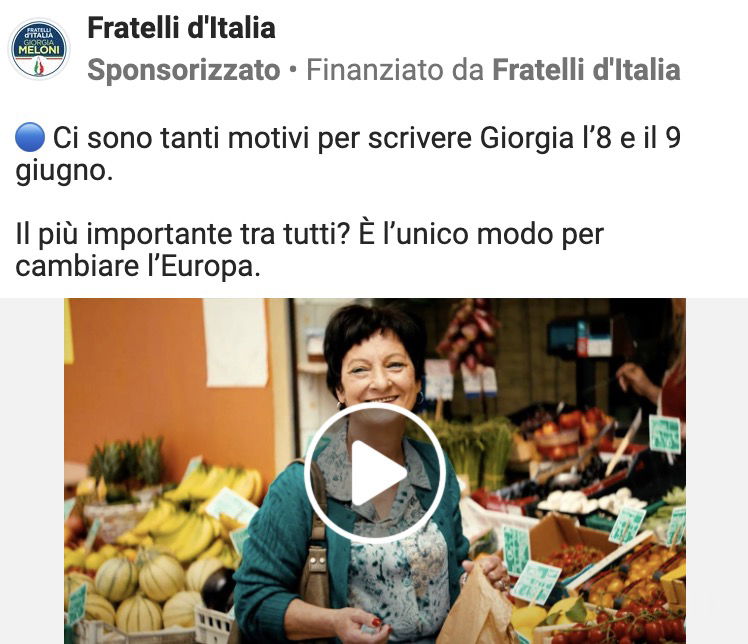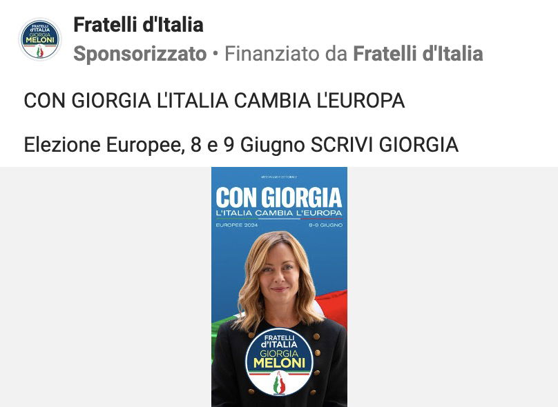 Una card semplice, con una caption altrettanto semplice. L’invito a votare Giorgia Meloni alle prossime europee è stato il post – attualmente attivo – su cui è stato fatto il maggior investimento (e proposto in tre versioni differenti, ma con lo stesso target).
