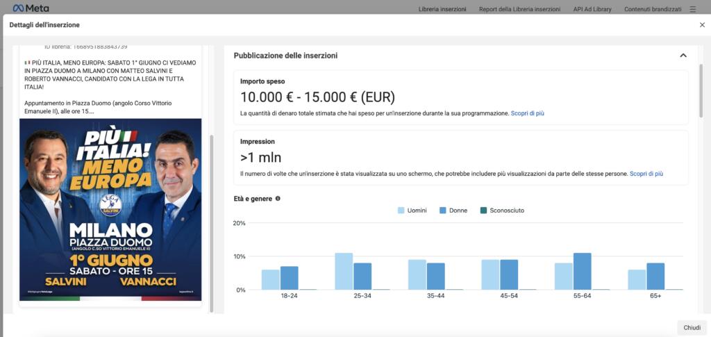 Questa inserzione è “scaduta” il 2 giugno ed era stata attivata il 19 maggio. Non sorprende, dunque, che la reach europea – potenziale audience distribuita tra tutti gli utenti Facebook di tutti gli Stati UE – sia stata molto ampia (parliamo di oltre 4,8 milioni) grazie a un investimento tra i 10 e i 15mila euro.
