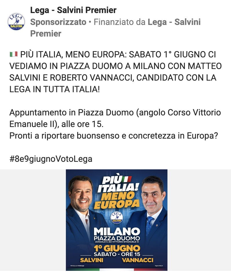 Per quel che riguarda la strategia, considerando che il partito (Lega) ha investito molti più soldi in inserzioni rispetto al leader (la pagina Facebook di Salvini), ci sono state delle scelte piuttosto singolari. Rispetto al passato, i contenuti sponsorizzati non sono card con proclami elettorali, ma soprattutto inviti ai comizi di piazza e – soprattutto – alla partecipazione agli eventi per la presentazione del libro scritto dal Segretario del Carroccio.