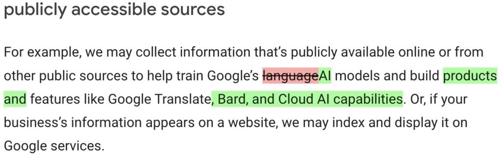 «Ad esempio, potremmo raccogliere informazioni pubblicamente disponibili online o da altre fonti pubbliche per contribuire all’addestramento dei modelli di AI di Google e alla creazione di prodotti e funzionalità quali Google Traduttore, Bard e funzionalità AI Cloud. Oppure, se le informazioni della tua attività vengono visualizzate su un sito web, potremmo indicizzarle e visualizzarle sui servizi Google».