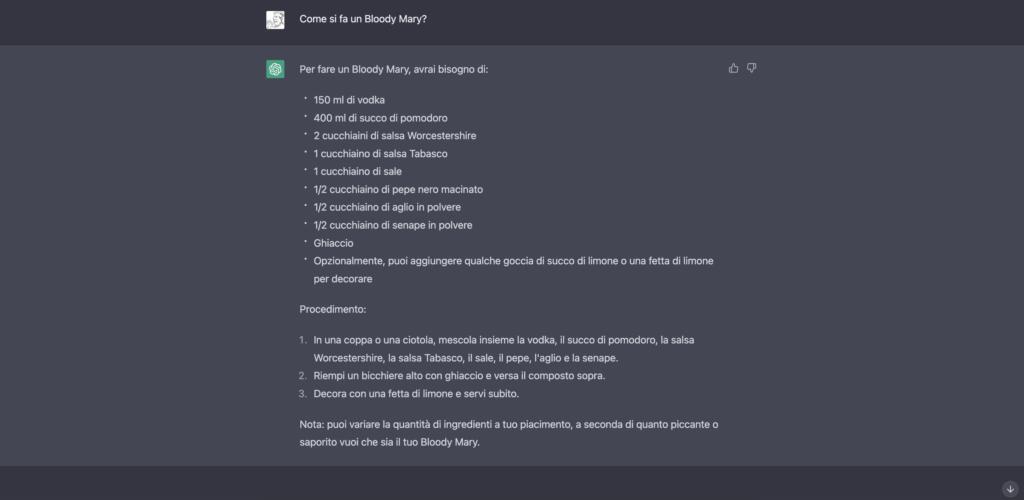 Evidenti lacune, dichiarate, che rendono questo modello attualmente imperfetto. Ovviamente di tratta di casi estremi, basati su eventi più recenti. Perché l’intelligenza artificiale è in grado di dare risposte puntuali quando si parla di temi generali, risposte sulla storia, senza riflessi sugli ultimi aggiornamenti. Come nel caso della Guerra in Ucraina, dove manca qualsiasi riferimento a quel che è accaduto nell’ultimo anno (si parla “solamente” di cosa è accaduto nel 2014, dell’annessione della Crimea e del fatto che le tensioni siano ancora in corso, senza citare Donbass e altro). Come detto, se le domande sono su temi generali o da risposte da “manuale”, la musica cambia. Per esempio, i problemi ChatGPT spariscono quando si parla di mixology, fornendoci la ricetta perfetta per preparare un Bloody Mary.