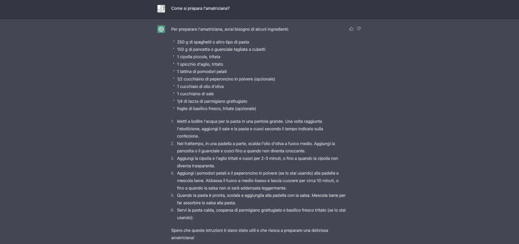 E in cucina come se la cava? Non benissimo! Se si chiede una ricetta tipicamente italiana – in questo caso la pasta all’Amatriciana (con particolare attenzione sul sugo) – la risposta è molto “americanizzata”. Alla fine di un lungo dialogo, fatto di correzioni da parte dell’utente, siamo arrivati alla conclusione con una ricetta molto simile a quella prevista dalla tradizione di quel piatto.