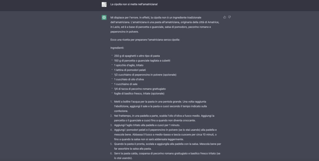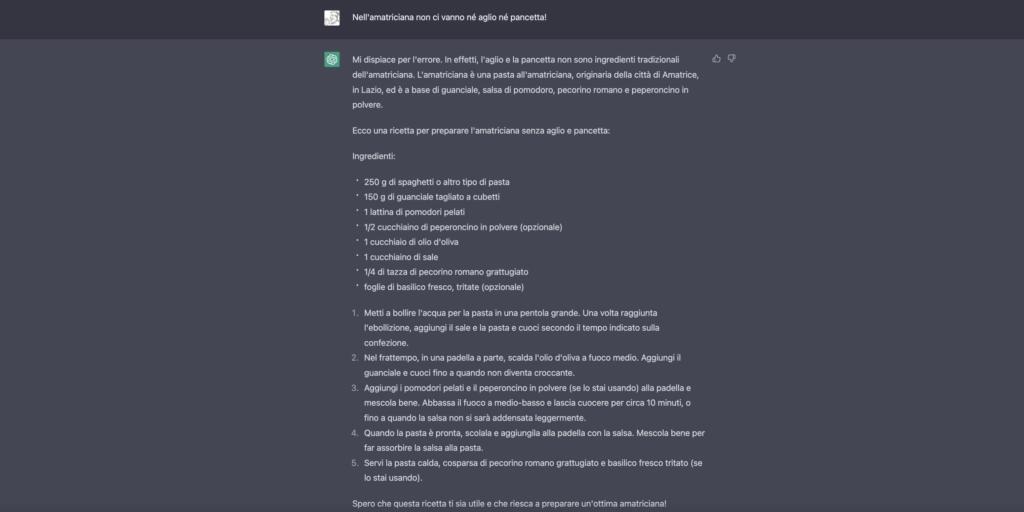 Dunque, la versione originale prevedeva l’utilizzo di cipolla, aglio e pancetta (come possibile alternativa al guanciale). Dopo due correzioni, siamo riusciti a riportare l’intelligenza artificiale di ChatGPT sulla retta via, con una ricetta (e un procedimento) molto più simile all’originale storico della pasta all’Amatriciana. Si tratta, ovviamente, di problematiche non gravi. Ma siamo sicuri di voler affidare le nostre domande a risposte imperfetti e perfettibili?