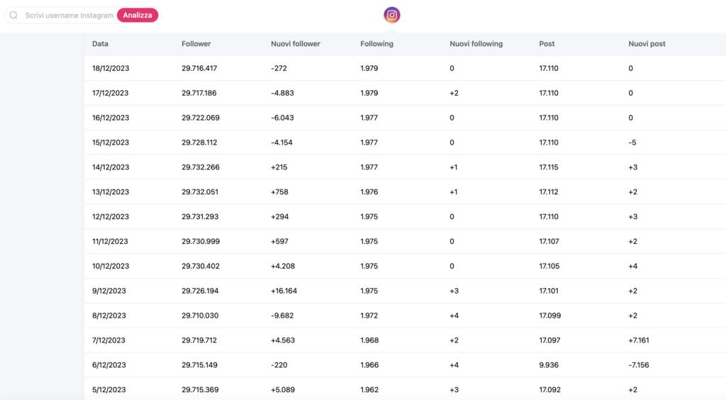 Questo, per esempio, è l’andamento – sempre per numero di follower – del profilo Instagram Chiara Ferragni nell’ultimo mese, dove si è registrato un picco di “seguaci” tra l’8 e l’11 dicembre (toccando il massimo storico). Dunque, a oggi, l’imprenditrice digitale è tornata a numeri già toccati all’inizio del mese, nonostante il brusco calo. Ma, come detto, il profilo è in costante crescita da tempo.