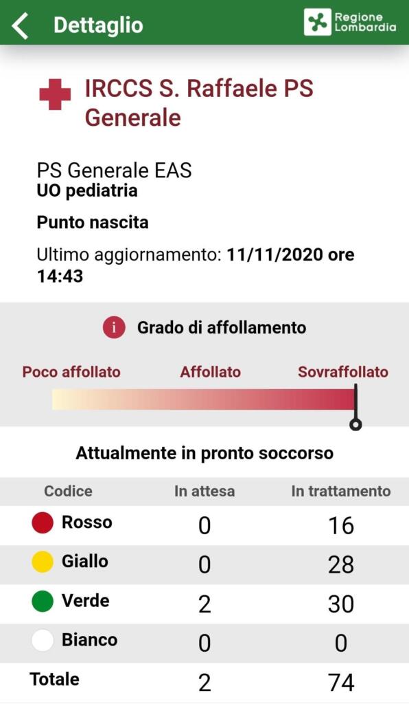 All’indomani della polemica, infatti, ci siamo collegati – attraverso l’app Salutile Pronto Soccorsi, che mostra lo stato di affollamento delle sale di attesa (e non solo) dei vari nosocomi in terra meneghina – per valutare, numeri alla mano, la reale situazione all’interno del Pronto Soccorso San Raffaele. E questo è quanto appare alle ore 14.43 di oggi, mercoledì 11 novembre.