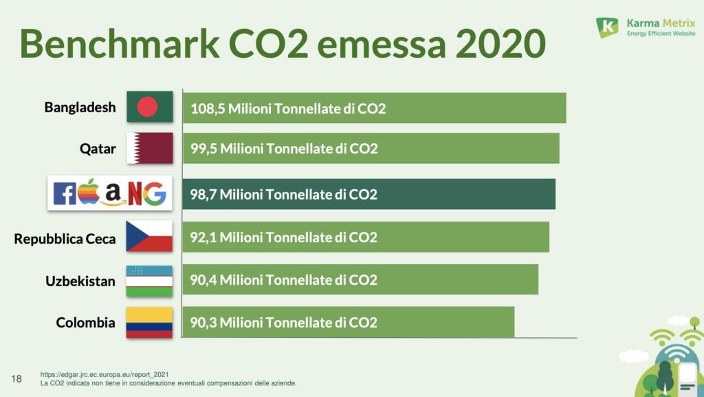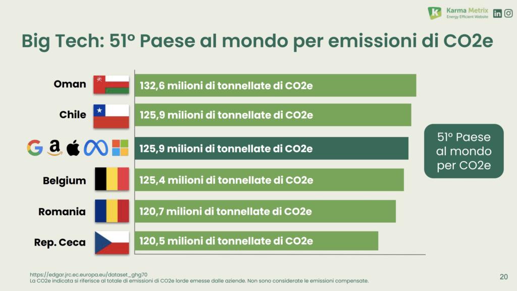 Alphabet, Amazon, Apple, Meta e Microsoft hanno prodotto (nel 2021, in base agli ultimi rapporti disponibili) ben 125,9 milioni di tonnellate di CO2e. Dunque, la “classifica” è di gran lunga cambiata. Ora Big Tech occupa il 51esimo posto, davanti a Belgio, Romania e Repubblica Ceca. Ovviamente, come si legge in calce alla slide, si parla di emissioni (senza compensazioni da parte delle aziende.