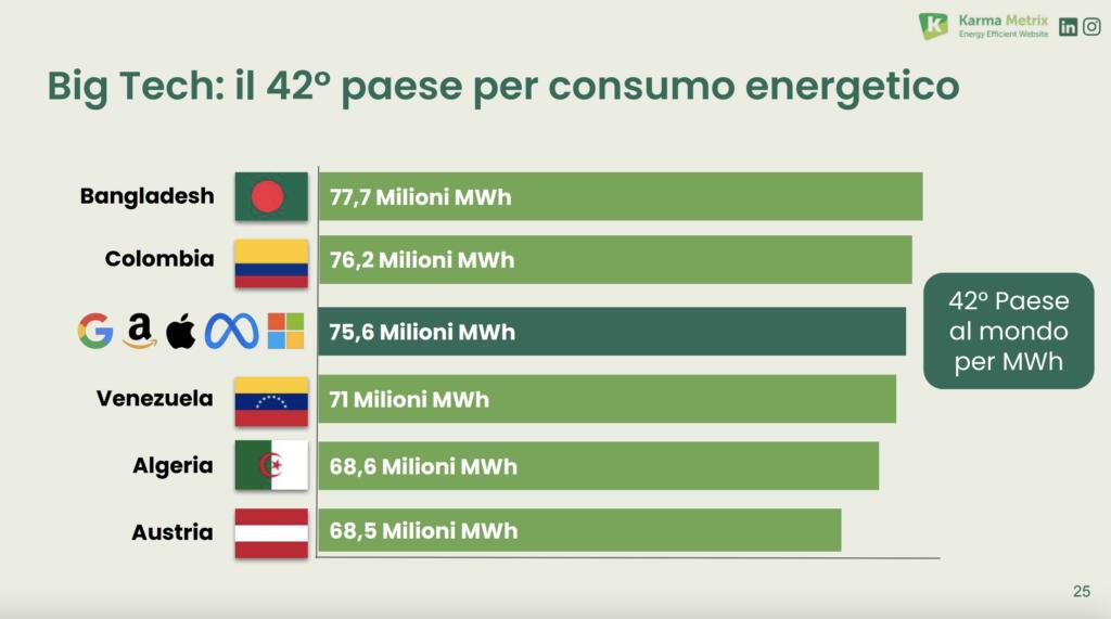 Come detto nella premessa, rispetto al report del 2022 sono cambiati gli attori in scena: fuori Netflix e dentro Microsoft (con annesso cambio di denominazione da Facebook alla holding Meta e di Google che rientra dentro Alphabet, Inc.). Facendo un primo confronto con lo sorso anno, appare evidente un dato costante: l’intero comparto web (quindi il mondo di internet in tutte le sue sfaccettature, comprendendo piccole, medie e grandi realtà) continua a essere il quarto “Paese” al mondo per quel che riguarda le emissioni di CO2e (CO2 equivalente). Un dato stabile, sintomo di una situazione che non è mutata. Anzi.