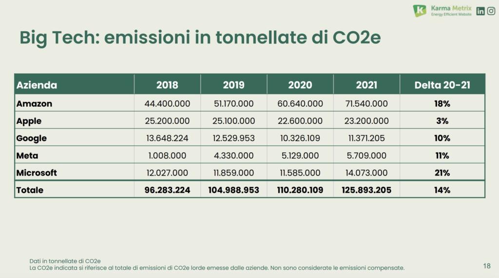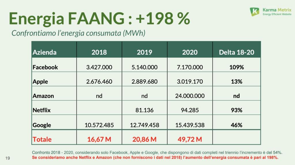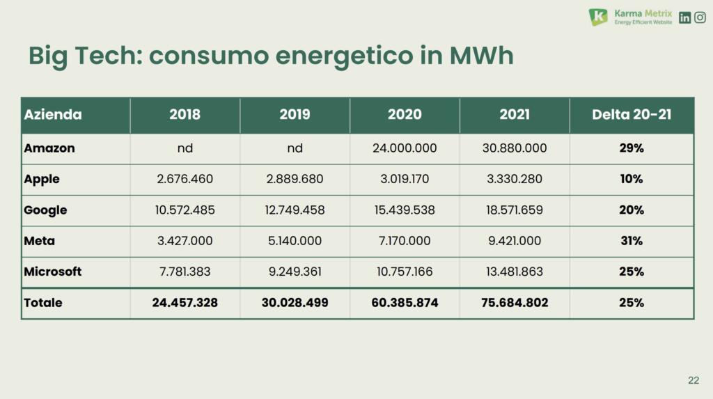 I dati di tutte le aziende Big Tech sono in aumento, con un delta positivo tra il 2020 e il 2021. E anche per quel che riguarda il consume energetico la situazione non è affatto differente.