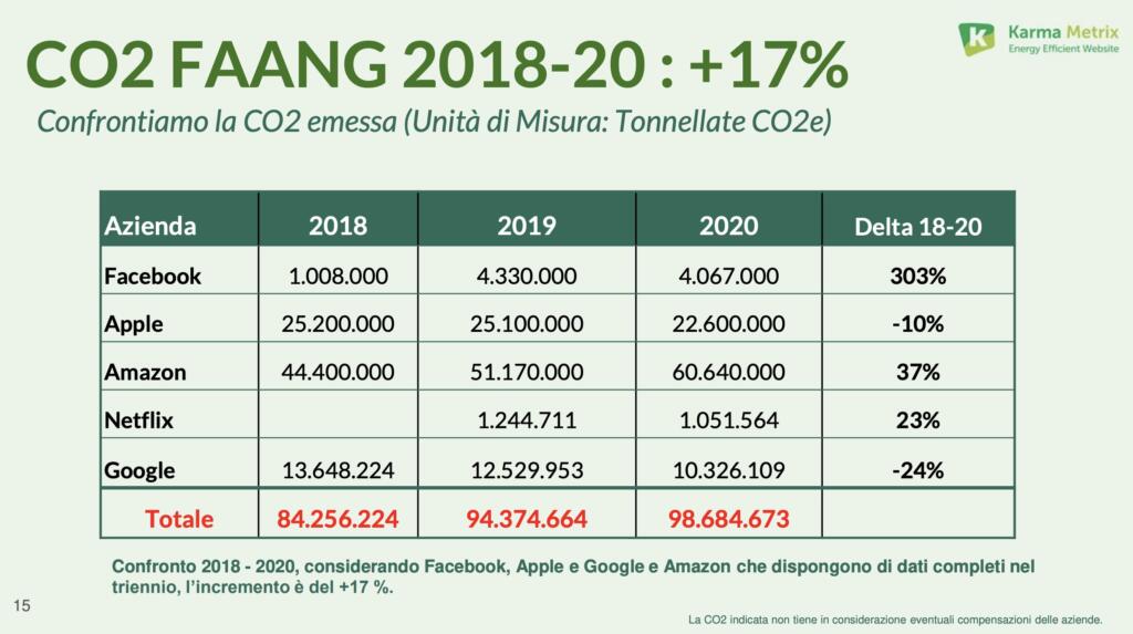Altro indice emblematico per capire quanto inquina Big Tech è il confronto con gli scorsi anni. Nella slide seguente di Karma Metrix, vediamo l’entità delle emissioni di CO2 di FAANG nel 2020.