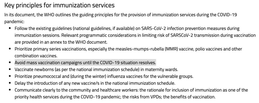 “Evitare le campagne di vaccinazione di massa fino a quando la situazione COVID-19 non si risolve”: così sul documento ufficiale OMS del marzo 2020.
