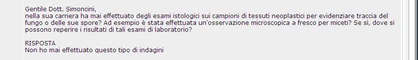 E LA PRASSI – A parte che non è vero che quella malattia è sempre presente in chi ha il cancro, per sua stessa ammissione Simoncini ha dichiarato di non aver mai cercato la candida nei tumori e non ha mai pubblicato dati scientifici o statistici sui risultati ottenuti: