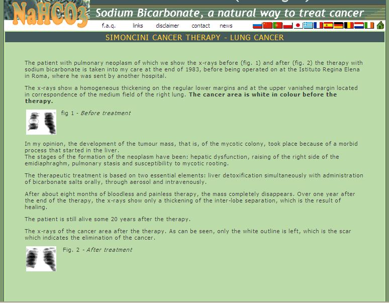 IL MALE E LA CURA – La cura, sempre secondo l’ex medico romano, sarebbe il bicarbonato di sodio per quasi tutti i tumori, tranne che per i melanomi cutanei, dove sarebbe indicata la tintura di iodio. Spiega Di Grazia:”A questa conclusione l’ex medico sarebbe giunto osservando che il mughetto (infezione provocata dalla candida nel cavo orale) dei bambini viene facilmente risolto con applicazioni di bicarbonato. Simoncini non ha mai sperimentato scientificamente questa teoria. Non esistono studi scientifici che provano che il bicarbonato possa curare un tumore”. Anche se c’è chi potrebbe contestare questa conclusione presentando questo link dell’ISS, dove si dice: