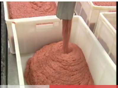 Invece questo è il video che mostra il risultato di una macchina che separa meccanicamente la carne, la poltiglia è la medesima; che ci siano le ossa o no, la poltiglia è vera, la foto è vera e in USA i bocconcini di pollo vengono fatti con quella roba.