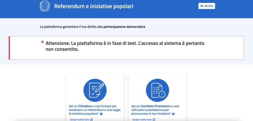 «Attenzione: la piattaforma è in fase di test. L’accesso al sistema è pertanto non consentito». I cittadini, dunque, non possono accedere. I comitati promotori, dunque, seguono la stessa sorte. Nonostante una legge approvata il 30 dicembre del 2020 ed entrata in vigore due giorni dopo. Nonostante un DPCM che, dopo anni, ha dato il via libera. Nonostante la messa online.