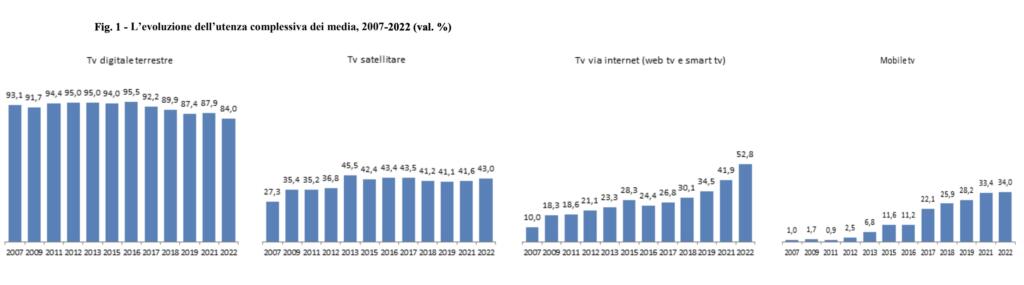 A pagina 5 della sintesi del 18esimo Rapporto Censis Comunicazione in Italia, troviamo questo grafico che fornisce alcune curiose indicazioni sulla fruizione del mezzo televisivo. Rispetto al 2021, l’utenza media complessiva italiana è calata di quasi 4 punti percentuali. Ma tutto quello che ruota attorno al concetto di televisione è cresciuto: sia la Tv satellitare che quella via internet, passando per la mobile tv. In tutti e tre i casi, viene segnato un trend positivo. Dunque, in molti casi (perché non si parla solo di Netflix, Prime Video o Disney+), è calato l’utilizzo del televisore e non della televisione. Alcuni canali vengono visti attraverso internet e non più con il classico strumento.
