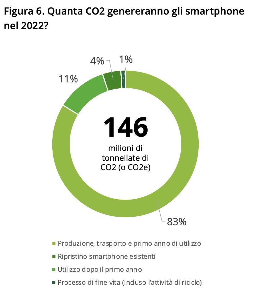 Il report fa riferimento ai dati raccolti nel 2021, con le previsioni sull’anno che si è concluso da poco. I numeri parlano piuttosto chiaro: «Nel 2022 gli smartphone, con la loro base istallata di 4,5 miliardi, genereranno 146 milioni di tonnellate di CO2 (o CO2 e, emissioni equivalenti) a livello globale. Si tratta di una quota contenuta rispetto al totale delle 34 giga tonnellate emesse complessivamente in tutto il mondo, ma resta comunque anche questa un’area da tenere in considerazione e in cui è possibile intervenire». Un micro-numero all’interno di un macro-numero, ma che ha comunque un peso rilevante all’interno del comparto dell’inquinamento ambientale.