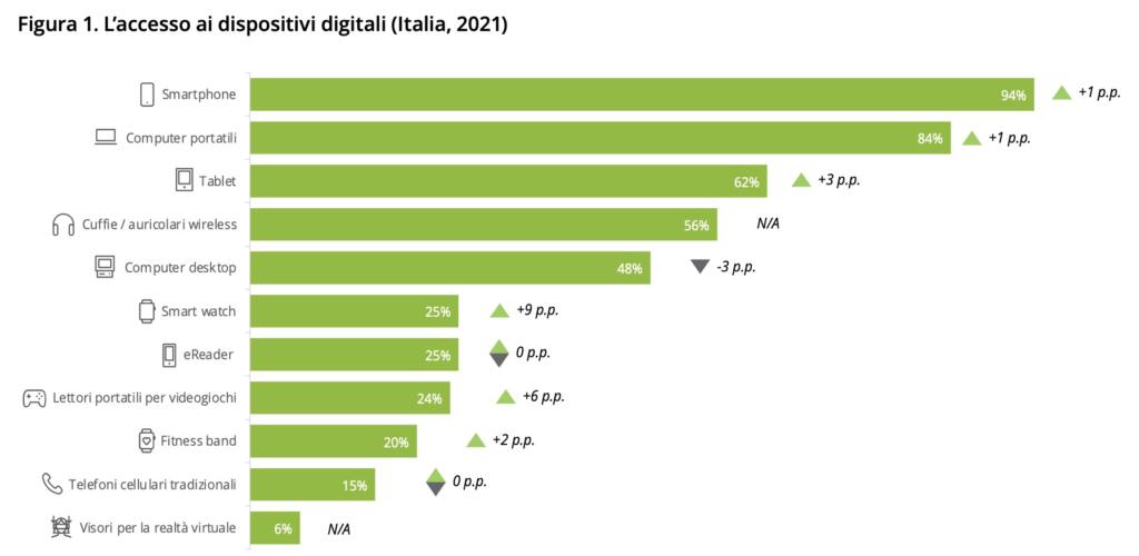 Il 94% degli italiani (secondo una rilevazione datata 2021, ma sempre attuale) effettua un accesso quotidiano al proprio dispositivo mobile. Una percentuale di 10 punti superiore rispetto all’accesso ai pc portatili e, di gran lunga, rispetto a tutti gli altri strumenti tecnologici.