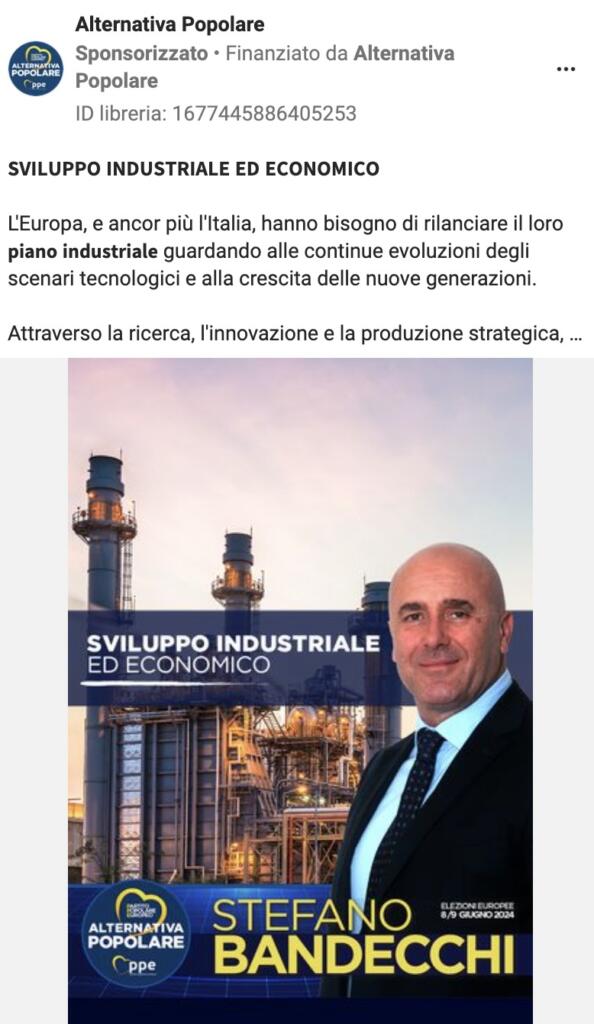 Il caso più particolare emerso nella nostra analisi della reach europea inserzioni su Facebook arriva da Alternativa Popolare di Stefano Banchetti. Il partito non ha investito moltissimo nei post sponsorizzati sulla piattaforma di Meta (tra gli 11.100 e i 15.373 euro per 27 inserzioni, a oggi), ma la reach europea totale (9.759.575) è stata di gran lunga superiore alle impressions “promesse” da Facebook (5.464.000). In particolare, c’è un post che ha ottenuto un incredibile successo, secondo questo parametro.