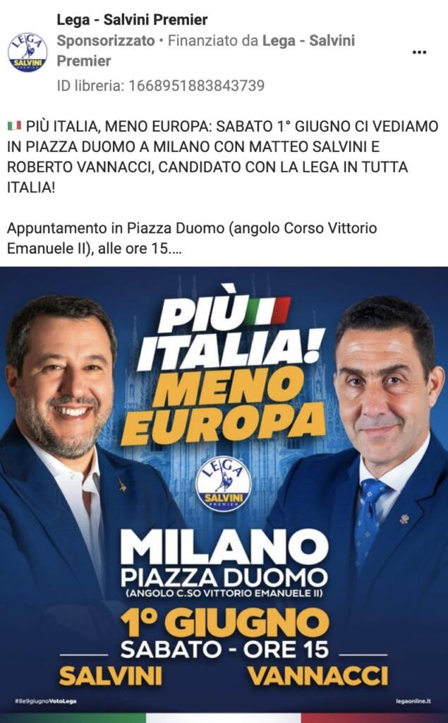 Si tratta di un post sponsorizzato dalla Lega – Salvini Premier per un periodo che è andato dal 19 maggio al 2 giugno per “annunciare” l’evento in piazza Duomo – a Milano – dove sul palco sono stati presenti sia il Segretario del Carroccio che Roberto Vannacci, candidato indipendente nelle liste del partito. Questa inserzione ha avuto molto tempo per “decantare”, rimanendo attiva per ben due settimane ed essendo destinato alla Regioni del Nord Italia, dove il partito ha i maggiori consensi elettorali. L’investimento fatto dal partito di via Bellerio è stato tra i 10mila e i 15mila euro e il suo obiettivo – secondo il tabellario di Facebook – era quello di superare il milione di impressions. Vedendo la reach europea ottenuta da questa inserzione, possiamo dire che l’obiettivo è stato raggiunto e superato: 4.827.218.