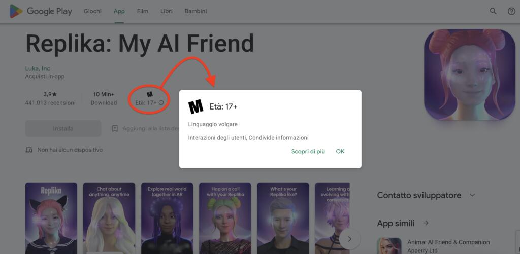 Età è l’altra parola-chiave. Perché qui subentra un altro tipo di problematica, in violazione non solo della tutela dei minori, legata all’utilizzo di queste applicazioni. In che senso? Basti pensare alla presentazione sugli app Store (per i dispositivi con sistema operativo iOS e Android) che viene fatta dell’applicazione sviluppata da Luka Inc, che, tra le tante cose, è anche la responsabile del trattamento dei dati.