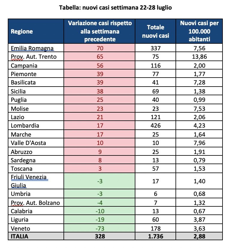 «Nell’ultima settimana – ha dichiarato Nino Cartabellotta spiegando i dati raccolti nell’ultime report dalla Fondazione Gimbe – due spie rosse confermano la necessità di mantenere alta la guardia, senza allarmismi ma con senso di grande responsabilità individuale e collettiva». Ecco i numeri della settimana che va dal 22 al 28 luglio:
