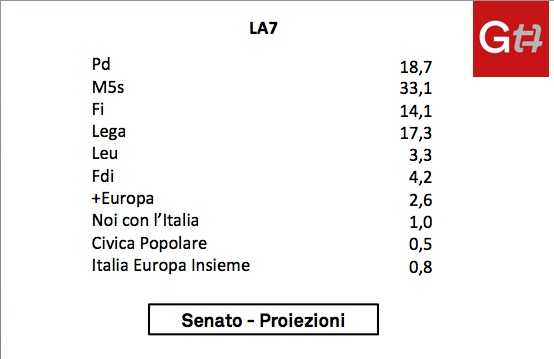 I primi exit poll di La7 Su un campione di 5 mila lettori – SWG/La7 movimento 5 stelle 28.30.8, Forza Italia 13.5 -15.5 Lega 12.3-14.3 Fdi 4.4 -5.4 Noi con L’italia 1.8 -2.4 Pd 21-23 Più Europa 2.8 -3.4 Civica Popolare 0.4 -1 Liberi E Uguali 5.2. – 6.2 PaP 1.4 – 1,2 CasaPound 0.3 -07