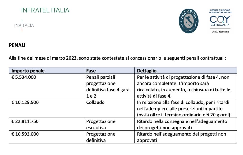 Sanzione per non aver rispettato il crono-programma per le attività di progettazione per quel che riguarda la gara 1 e 2; sanzione per i ritardi nella fase di collaudo. Sanzione per il ritardo nella consegna e nelle nuove versioni dei progetti inizialmente non approvati; ritardo nell’adeguamento – in fase di progettazione definitiva – dei progetti contestati. Dunque, penali per circa 50 milioni di euro.