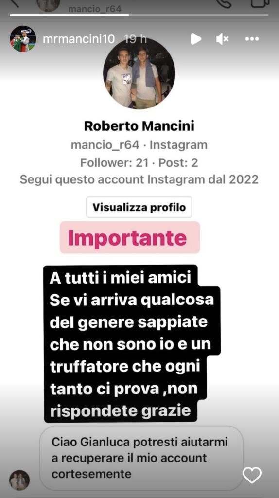 «Ciao Gianluca potresti aiutarmi a recuperare il mio account cortesemente», si legge nel messaggio. A inviarlo è un profilo che ha lo stesso nome (ma non tag-name) del commissario tecnico della Nazionale: mancio_r64 (un profilo con soli due post all’attivo sul social delle fotografie) . E, pur non avendo come foto profilo l’immagine del Roberto Mancini famoso, tutte le caratteristiche fanno pensare proprio all’ex calciatore di Sampdoria e Lazio: perché Mancio è sempre stato il suo soprannome (e diminutivo) e “64” è il suo anno di nascita.