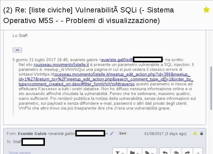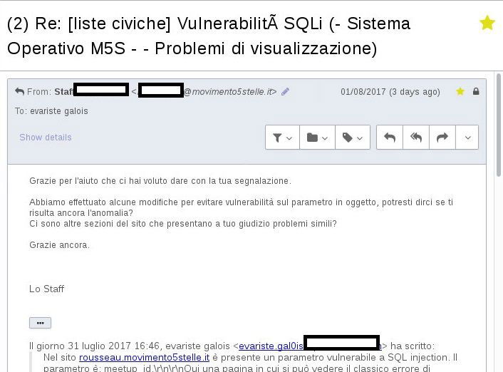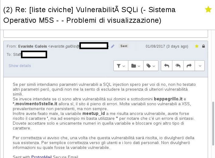 Segue un’altra mail dove il white hat spiega quali altri problematiche possano esserci. E assicura: quando la vulnerabilità sarà risolta, Evariste parlerà del problema. Nei dovuti termini, proprio per non danneggiare il MoVimento.