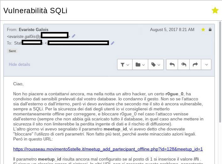 C’è uno scambio di mail, avvenuto circa un anno fa, che testimonia le buone intenzioni di Evariste Galois, l’hacker buono, white hat, che svelò allo staff del MoVimento le fragilità del sistema Rousseau.