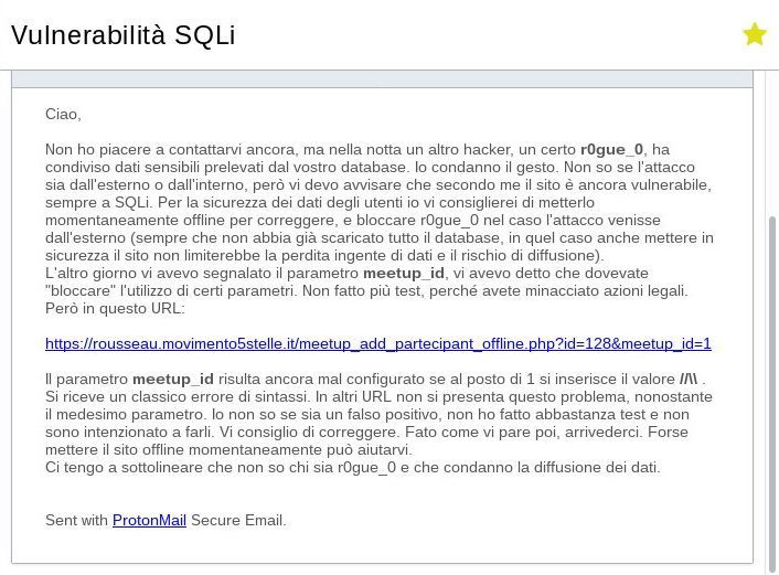 L’Associazione Rousseau ha quindi subito una violazione dei suoi server da parte degli hacker Evariste Galois e Rogue0, ha subito il furto dei dati presenti nel database da parte dell’hacker rogue0 che in seguito ha messo in vendita questi dati e afferma, sempre su Twitter, di aver concluso la vendita.