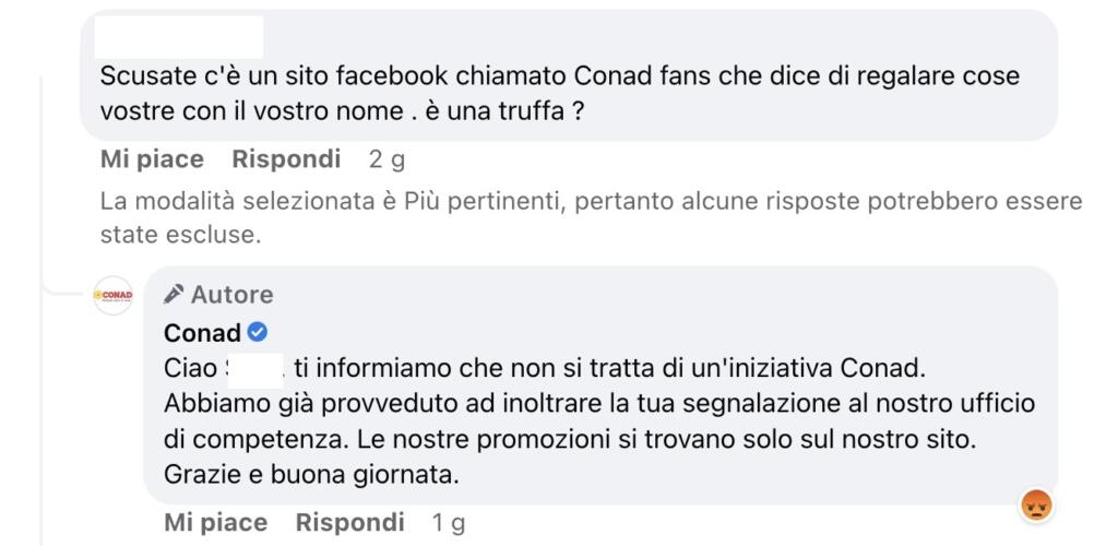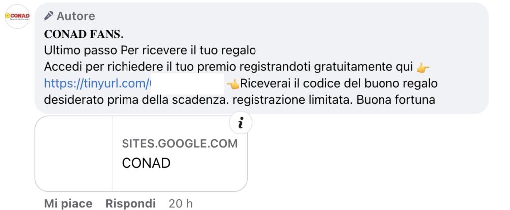Pagine Facebook che nascono dal giorno alla notte, proponendo esclusivi concorsi legati a grandi e riconoscibili brand con premi che l’utente può ottenere solo scrivendo “fatto” tra i commenti dopo aver compilato un form online (su un sito esterno). Una dinamica che ci siamo trovati di fronte già in passato e che ora si è ripetuta con la truffa dei sacchetti regalo Conad. Ovviamente la nota catena di supermercati non ha alcune responsabilità (anzi, dopo le segnalazioni degli utenti hanno avviato indagini), ma in tanti – attirati dal “dono” – hanno creduto a quella favola regalando (ed è il male minore) i propri dati a non si sa chi.