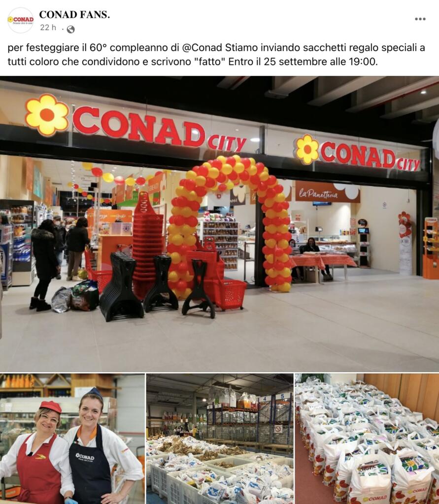 Conad non sta inviando “sacchetti regalo” a chi scrive «fatto» su Facebook