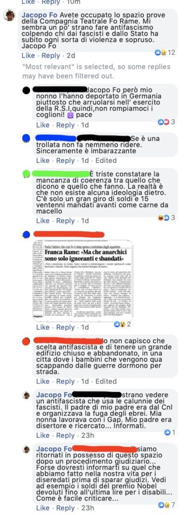 I commenti non sono molti, ma tra questi ve n’è uno che attira particolarmente l’attenzione. Con un tono chiaramente sarcastico Jacopo Fo scrive: «Avete occupato lo spazio prove della Compagnia Teatrale Fo Rame. Mi sembra un po’ strano fare antifascismo colpendo chi dai fascisti e dallo Stato ha subito ogni sorta di violenza e sopruso».