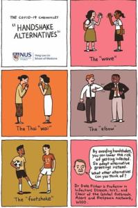 Il tutto è stato approvato dalla direttrice delle pandemie dell’Oms, Sylvie Briand, ed è stato messo a punto da una vignetta realizzata dalla Yong Loo Lin School of Medicine di Singapore. Si mostra come sia possibile mantenere rapporti cordiali evitando le classiche strette di mano. Saluti creativi e innovativi che possono far sorridere, ma rientrano tra le soluzioni da poter adottare per evitare – o, almeno, scongiurare – nuovi contagi. Il tutto con poche e semplici mosse.