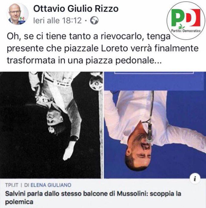 Il candidato del Partito Democratico a Pavia aveva scelto quel parallelo, che da tempo gira sui social, sulla vicinanza delle parole di Matteo Salvini alle politiche neofasciste o non dissimili a quelle di Benito Mussolini durante il ventennio fascista. Il tutto partito da quel comizio del leader della Lega dal contestato balcone di Forlì, da dove il duce aveva assistito all’uccisione di alcuni partigiani, poi impiccati ai lampioni, e dove lo stesso Mussolini tenne alcuni comizi. E il commento a quella foto era sferzante: «Oh, se ci tiene tanto a rievocarlo, tenga presente che piazzale Loreto verrà finalmente trasformata in una piazza pedonale».