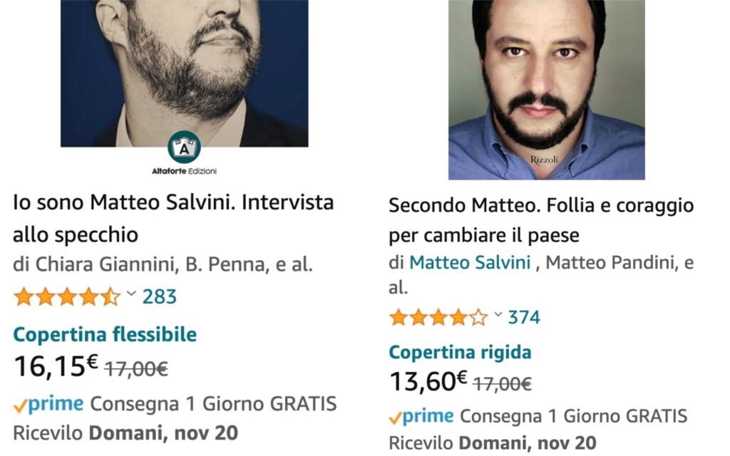 Ed ecco che, nella categoria ‘libri’ troviamo due lavori incentrati sul senatore della Lega: ‘Io sono Matteo Salvini. Intervista allo specchio’ (di Chiara Giannini, con la prefazione di Maurizio Belpietro) e ‘Secondo Matteo. Follia e coraggio per cambiare il Paese’ (scritto a quattro mani dal segretario del Carroccio e da Matteo Pandini’. E sono proprio lì, sul tanto detestato Amazon. E, tra le tante cose, sono a che in offerta per i clienti Amazon Prime. Insomma, i veri fan del leghista potranno sfruttare questo sconto per regalarne copie ai propri parenti e amici.