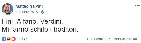«Fini, Alfano, Verdini. Mi fanno schifo i traditori», scriveva su Facebook Matteo Salvini il 2 ottobre 2015. Un giudizio ribadito non solo sul social di Zuckerberg, ma anche su Twitter. Insomma, non aveva una grande stima di Denis Verdini reo di aver abbandonato Silvio Berlusconi e il Centrodestra alla ricerca di una sopravvivenza, legandosi ad altri partiti e facendo accordi per garantire una larga maggioranza al governo del periodo.